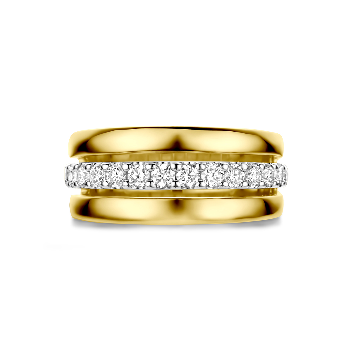 14k Bicolor geel en witgouden ring uitgevoerd met diamant. De ring heeft een breedte van 9mm en het diamantgewicht is 0.57ct.
