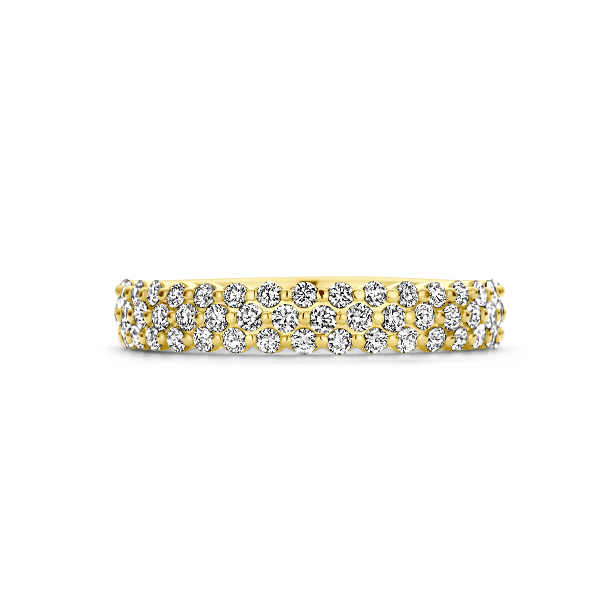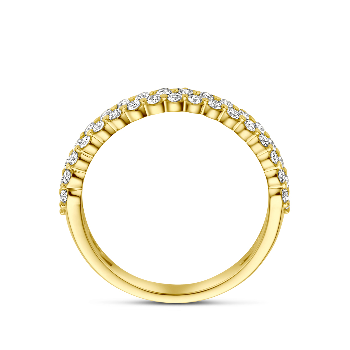 14k Geelgouden ring uitgevoerd met schitterende diamant. De ring heeft een breedte van 4mm.
