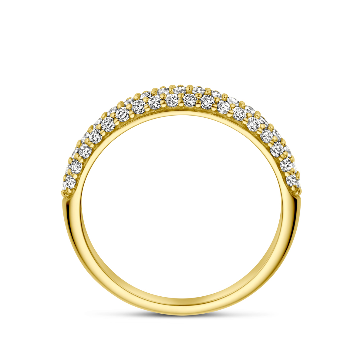 14k Geelgouden ring uitgevoerd met schitterende diamanten. De ring heeft een breedte van 3.5mm.