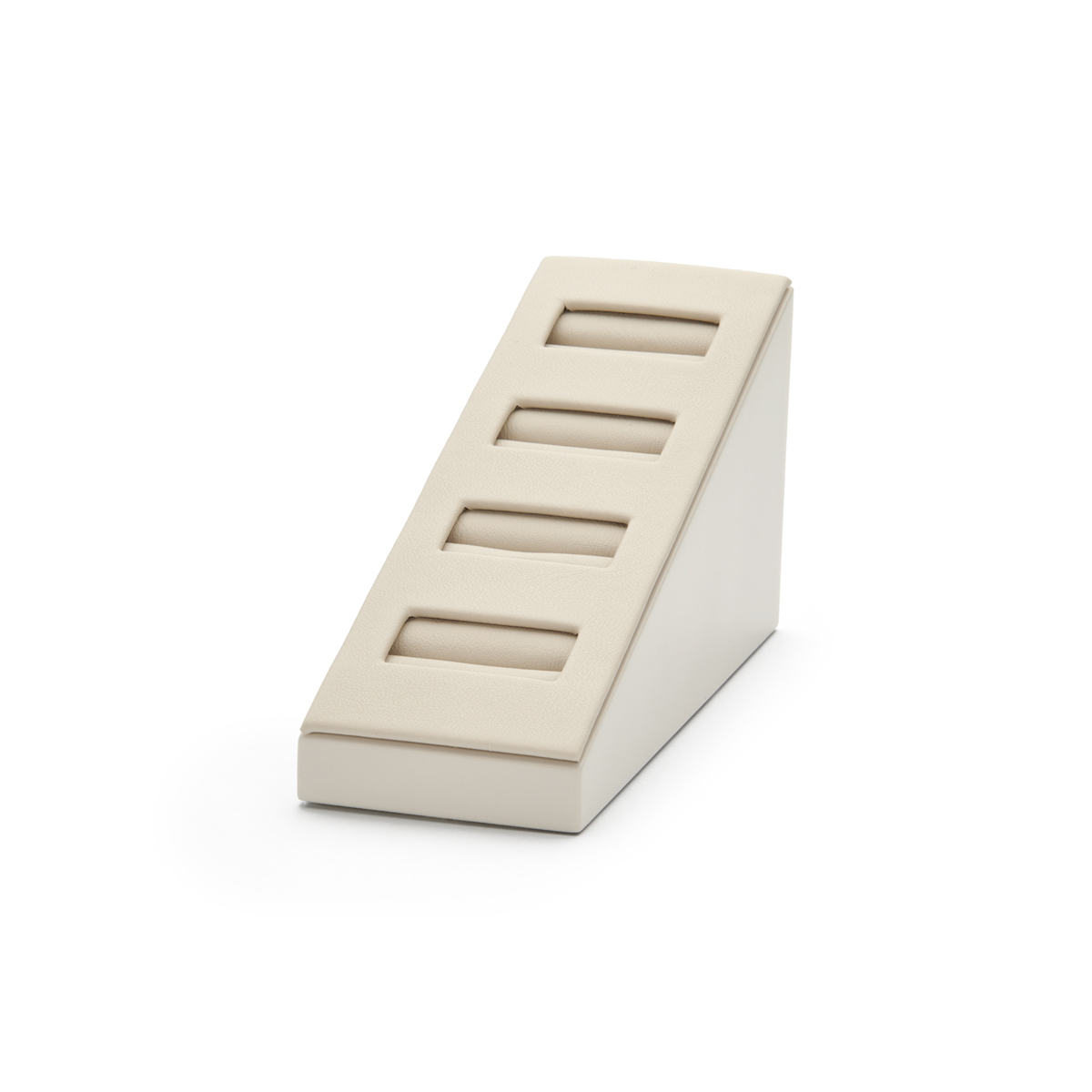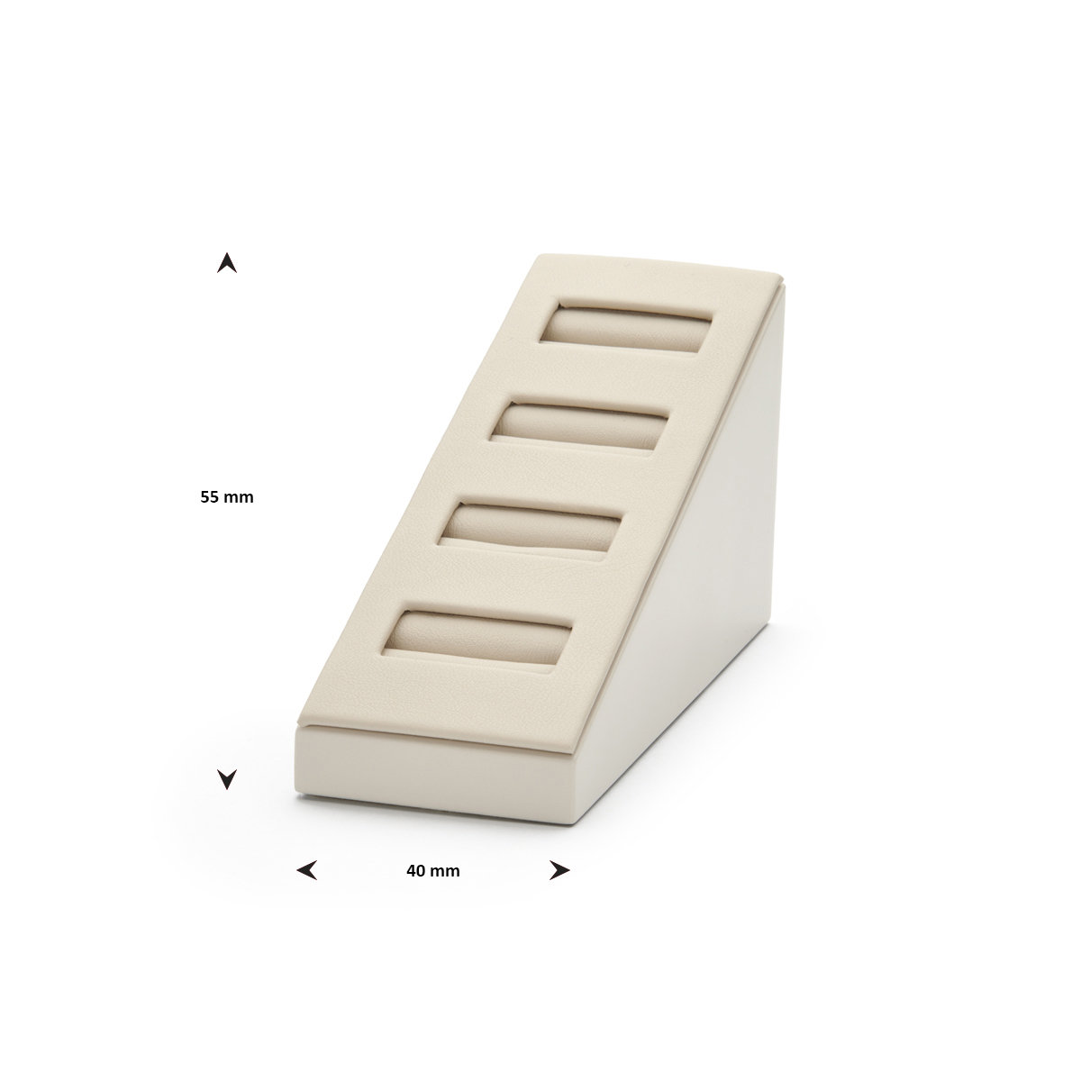 Kunststof ringen display waar 4 ringen op gepresenteerd kunnen worden. Het display is voorzien van een beige lederlook bovenlaag en beige gespoten lak met matte afwerking en wordt geleverd excl. ringen. Wegens hoge bezorgkosten wordt dit artikel alleen verstuurd bij een ordergrootte vanaf €50,-.