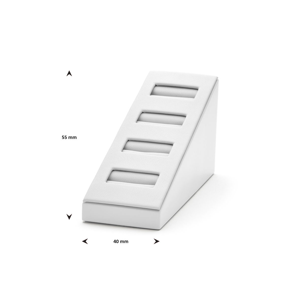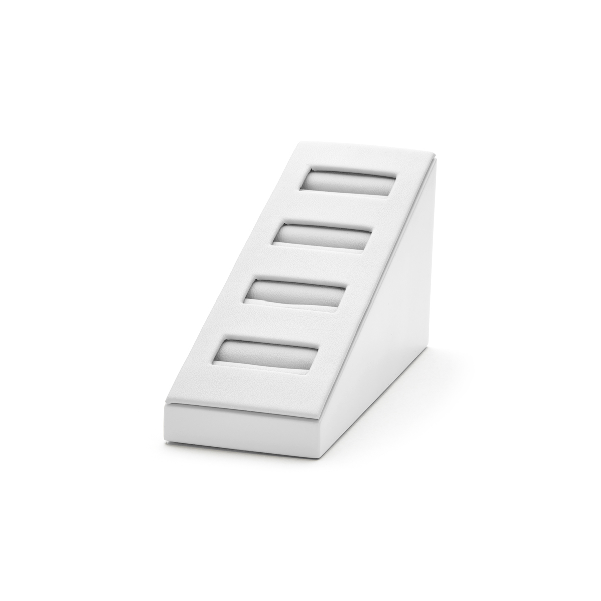 Kunststof ringen display waar 4 ringen op gepresenteerd kunnen worden. Het display is voorzien van een witte lederlook bovenlaag en wit gespoten lak met matte afwerking en wordt geleverd excl. ringen. Wegens hoge bezorgkosten wordt dit artikel alleen verstuurd bij een ordergrootte vanaf €50,-.