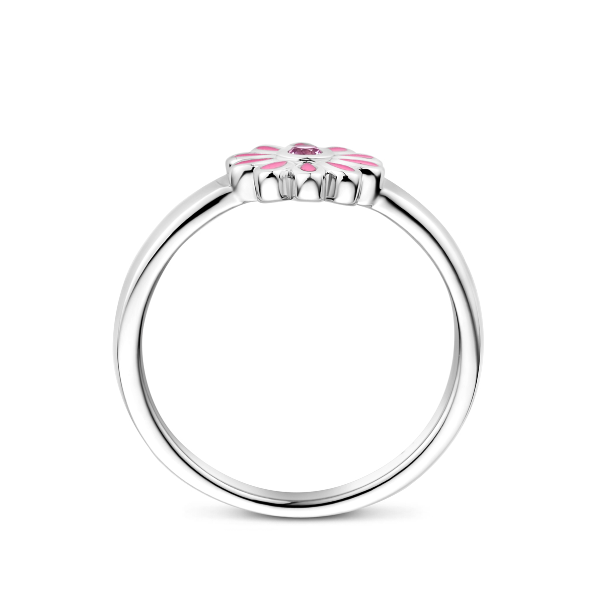 Gerhodineerd 925 zilveren ring uitgevoerd met een emaille bloem met daarin een schitterende roze zirkonia. De ring heeft een breedte van 6.5mm.