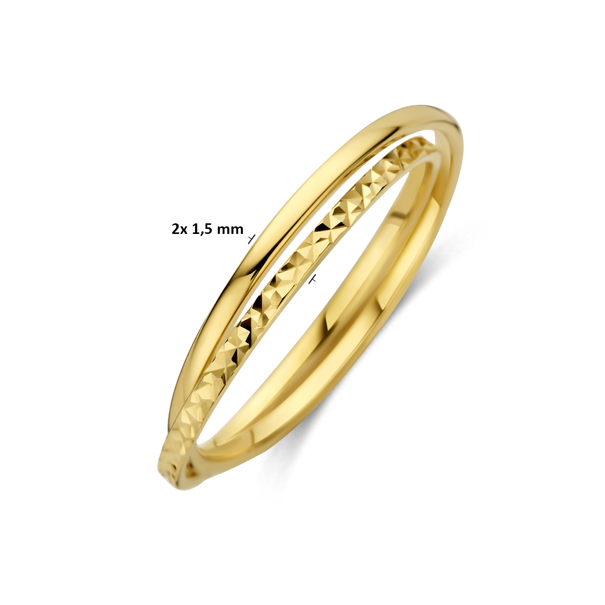 14k Geelgouden ring bestaat uit 2 losse ringen in elkaar geplaatst. De losse ringen hebben elk een breedte van 1.5mm.