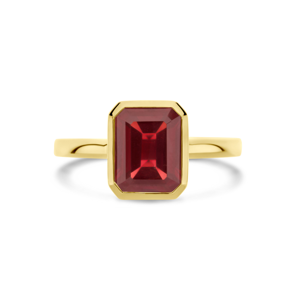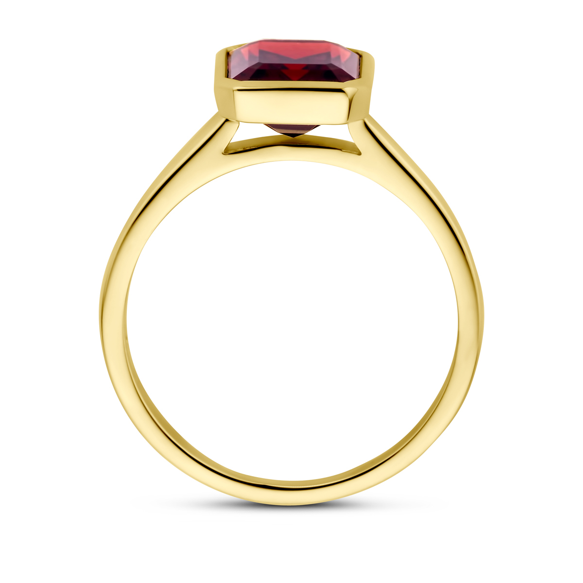 14k Geelgouden ring uitgevoerd met granaat. De ring heeft een breedte van 10mm.