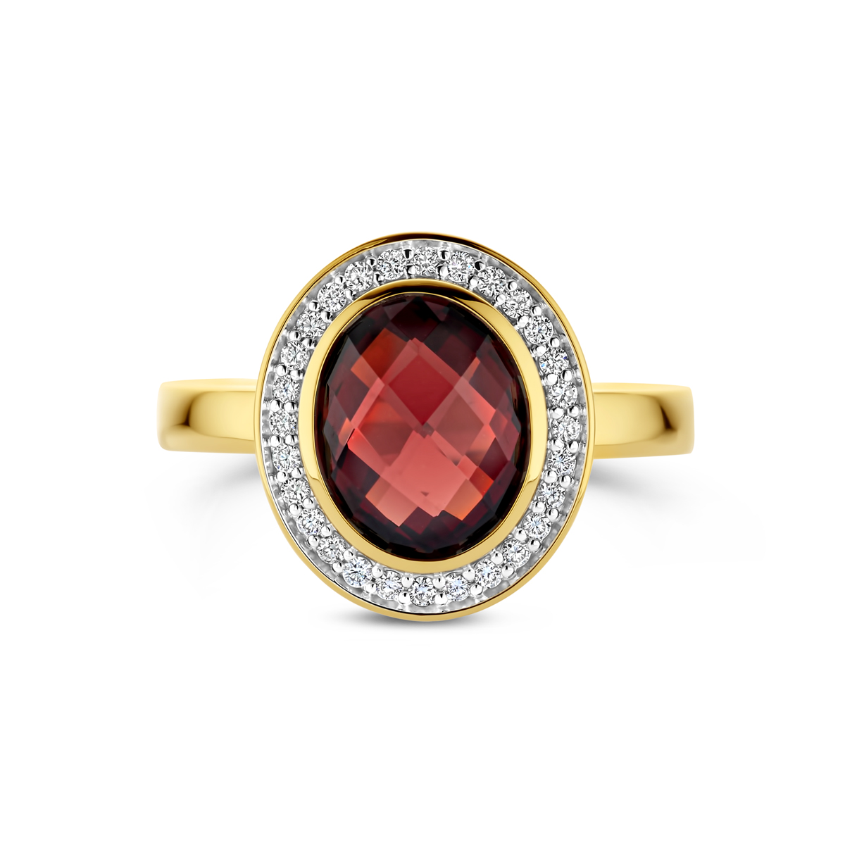 14k Geelgouden ring uitgevoerd met granaat en diamant. De ring heeft een afmeting van 15x13mm. De totale diamantgewicht is 0.18ct.