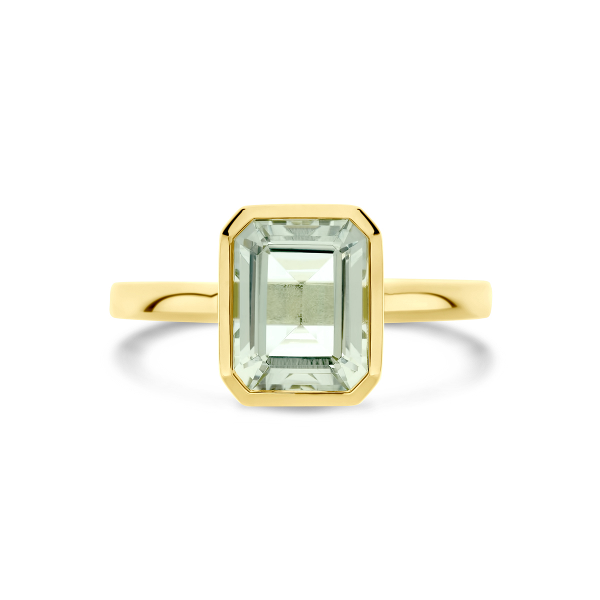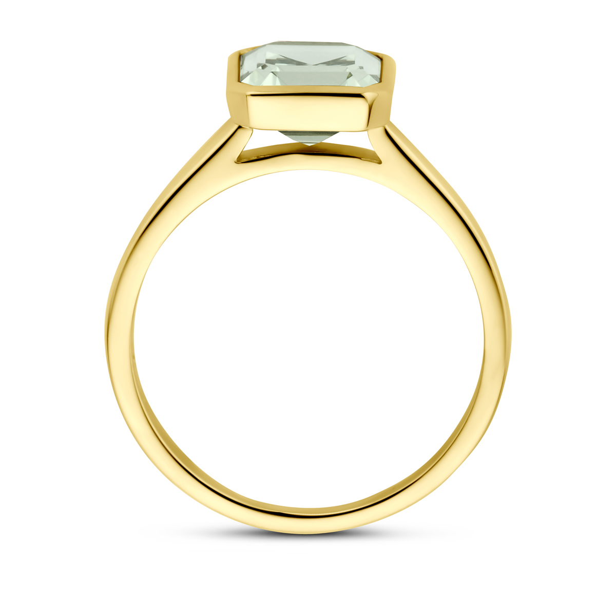 14k Geelgouden ring uitgevoerd met groen amethist. De ring heeft een breedte van 10mm.