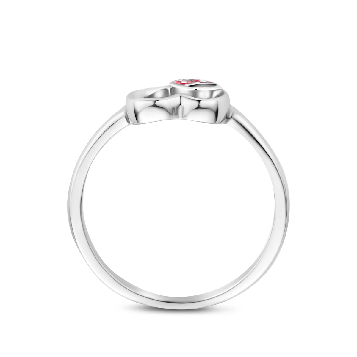 Gerhodineerd zilveren ring met opengewerkt hart en een lieveheersbeestje van emaille. De ring heeft een scheen van 1.6mm en een breedte van 7mm. De ring is te combineren met bijpassende sieraden uit onze collectie