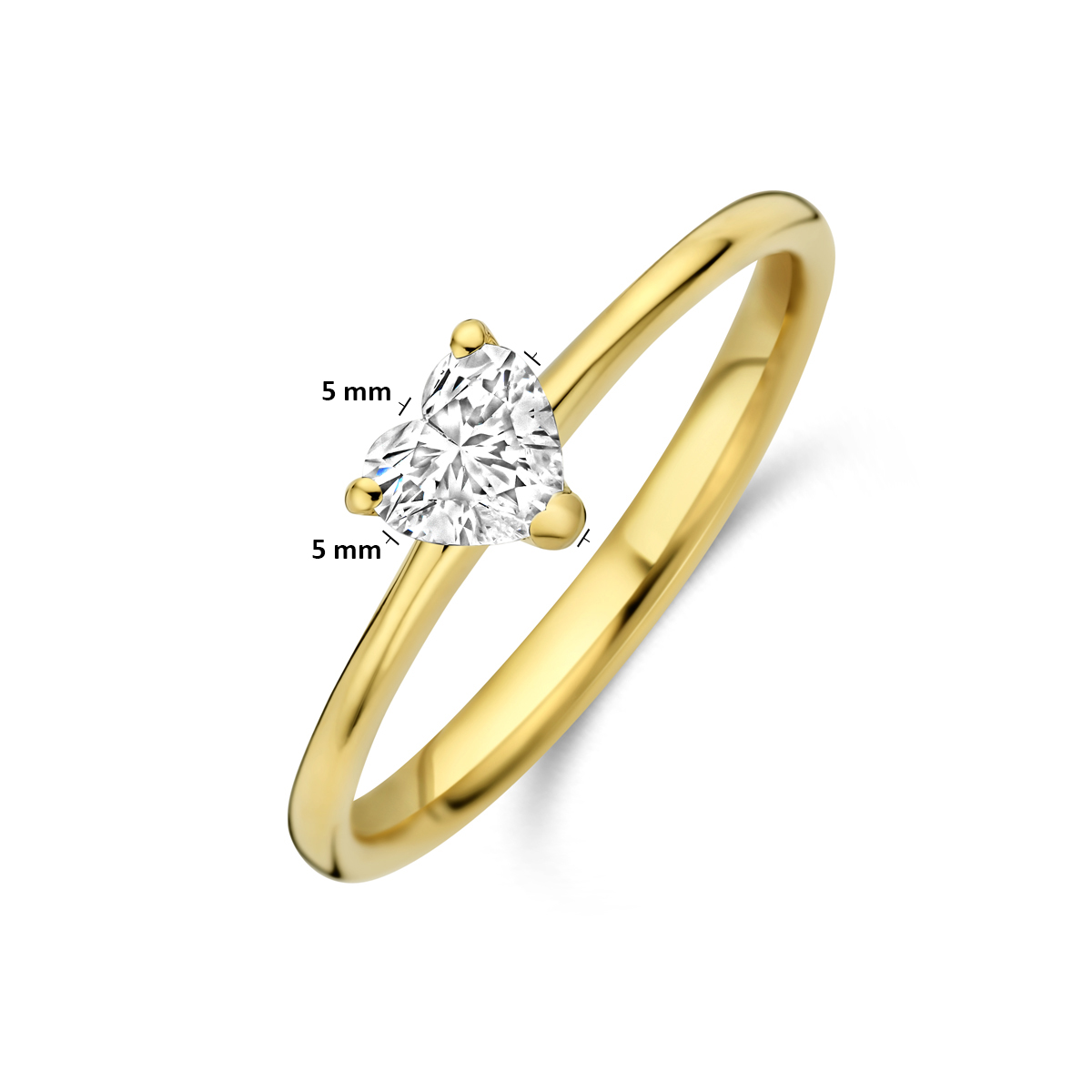 14k Geelgouden ring uitgevoerd met een hartje lab grown diamant van 5x5mm. Het totale diamantgewicht is 0.30ct. Onder extreem hoge druk en temperatuur wordt het natuurlijk ontstaansproces nagebootst met als eindresultaat een diamant met dezelfde chemische eigenschappen maar met een andere oorsprong.