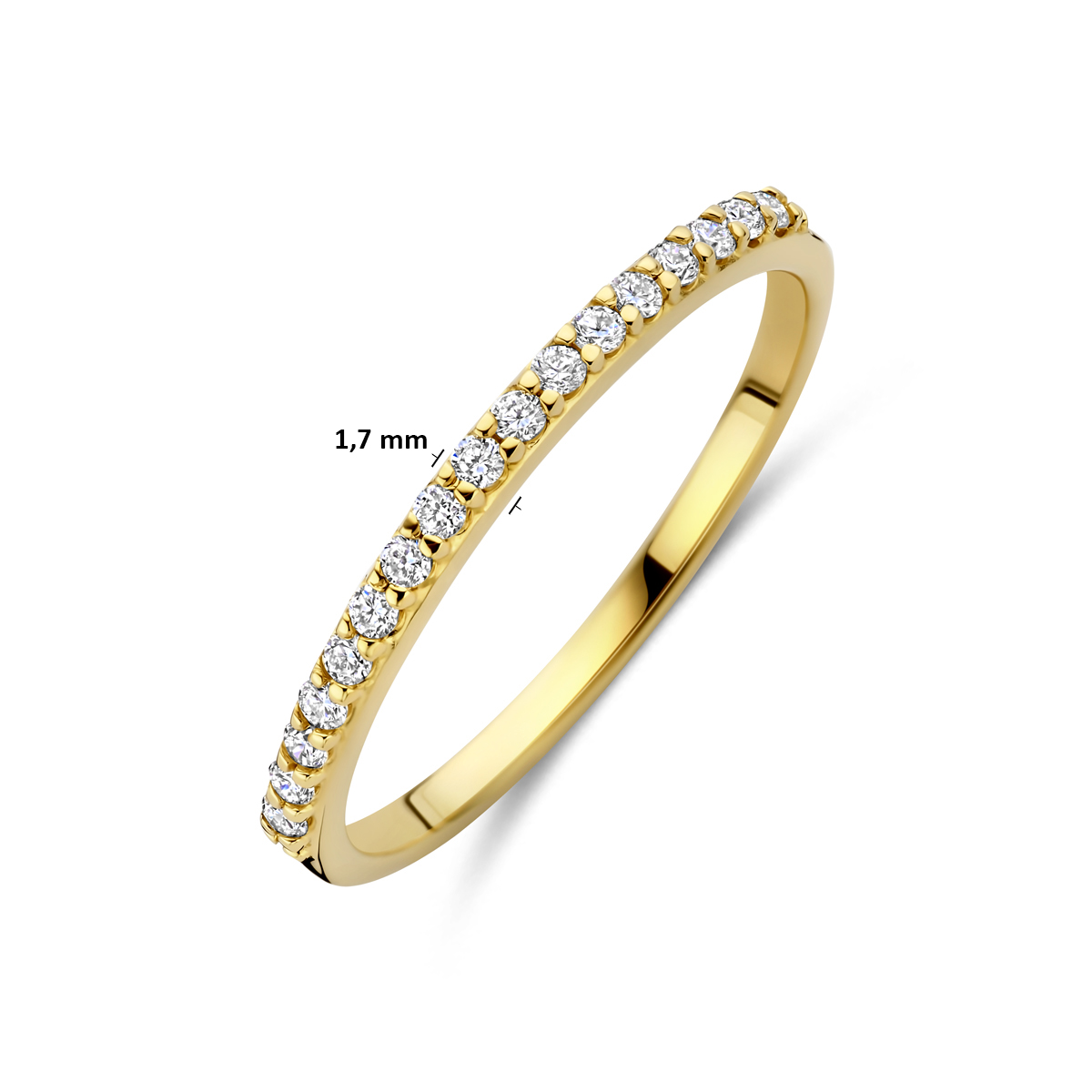 14k Geelgouden ring uitgevoerd met lab grown diamant. Het totale diamantgewicht van de ring is 0.17ct. Lab grown diamanten zijn diamanten die ontstaan in een laboratorium. Onder extreem hoge druk en temperatuur wordt het natuurlijk ontstaansproces nagebootst met als eindresultaat een diamant met dezelfde chemische eigenschappen maar met een andere oorsprong.
