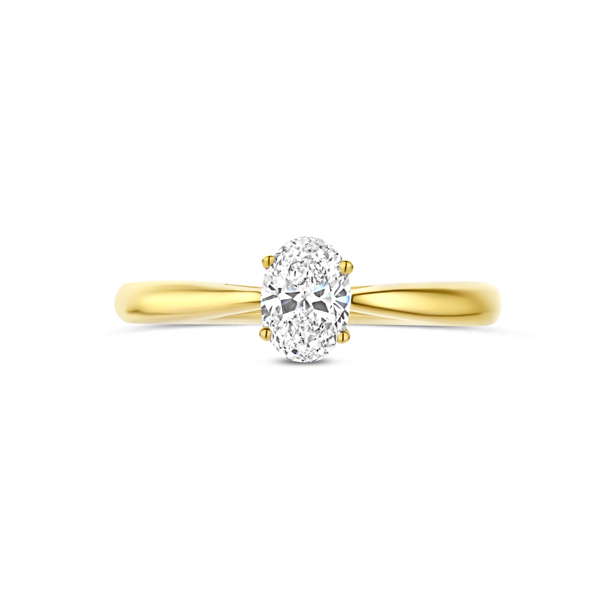 14k Geelgouden ring uitgevoerd met lab grown diamant van 6.5×4.5mm. Het totale diamantgewicht is 0.50ct. Onder extreem hoge druk en temperatuur wordt het natuurlijk ontstaansproces nagebootst met als eindresultaat een diamant met dezelfde chemische eigenschappen maar met een andere oorsprong.