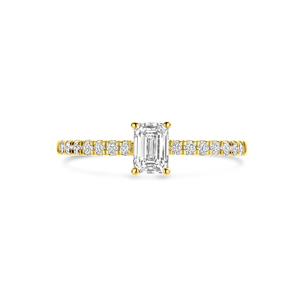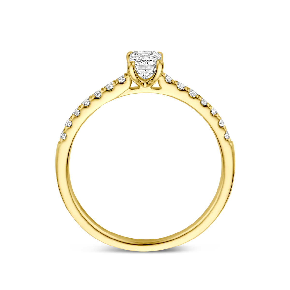 14k Geelgouden ring uitgevoerd met lab grown diamant. De steen heeft een afmeting van 5,5×4,0mm. Het totale diamantgewicht is 0.58ct. Lab grown diamanten zijn diamanten die ontstaan in een laboratorium. Onder extreem hoge druk en temperatuur wordt het natuurlijk ontstaansproces nagebootst met als eindresultaat een diamant met dezelfde chemische eigenschappen maar met een andere oorsprong.