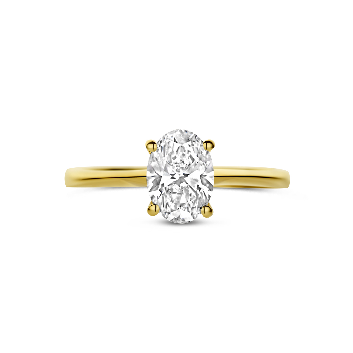 14k Geelgouden ring uitgevoerd met lab grown diamant. De ring heeft een afmeting van 8×5.5mm. Het totale diamantgewicht is 1.00ct. Onder extreem hoge druk en temperatuur wordt het natuurlijk ontstaansproces nagebootst met als eindresultaat een diamant met dezelfde chemische eigenschappen maar met een andere oorsprong.