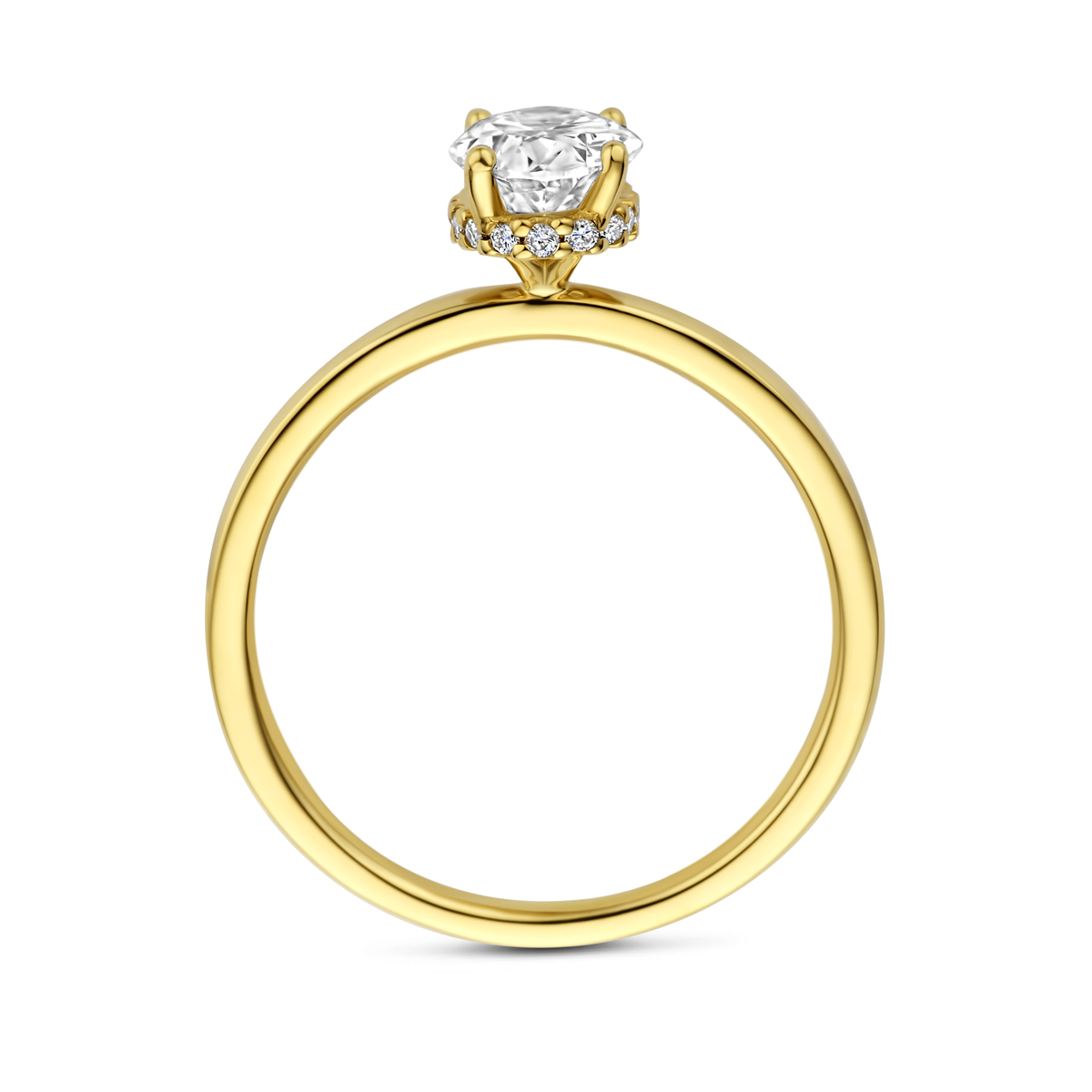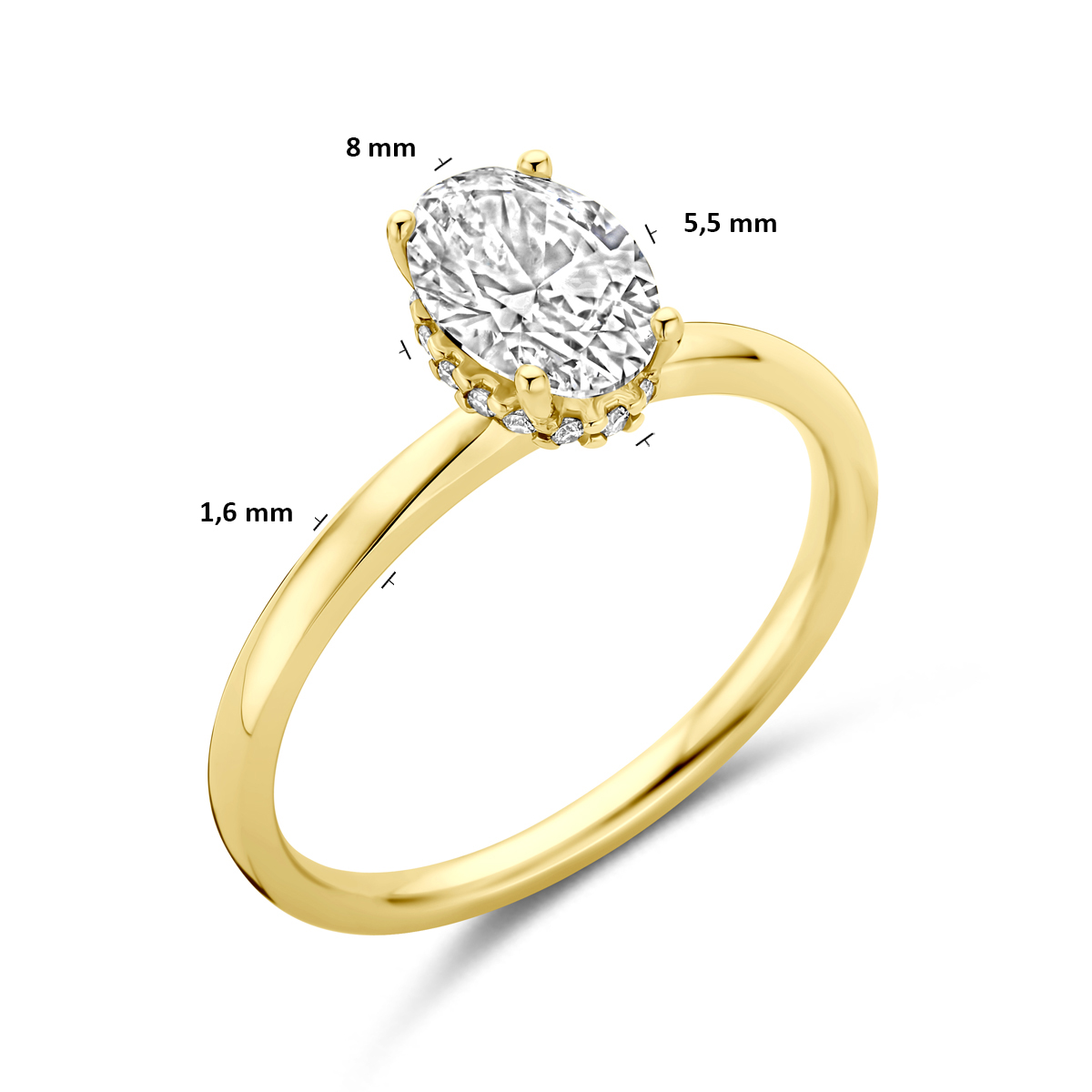 14k Geelgouden ring uitgevoerd met lab grown diamanten. De ringkop heeft een afmeting van 8×5.5x5mm. Het totale diamantgewicht is 1.07ct.