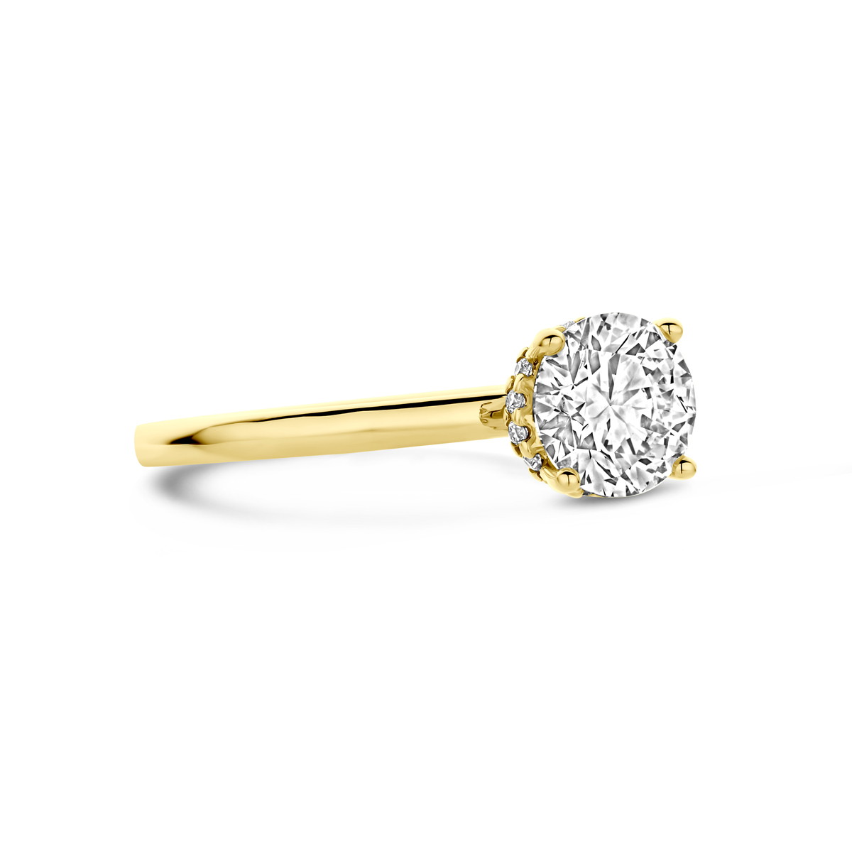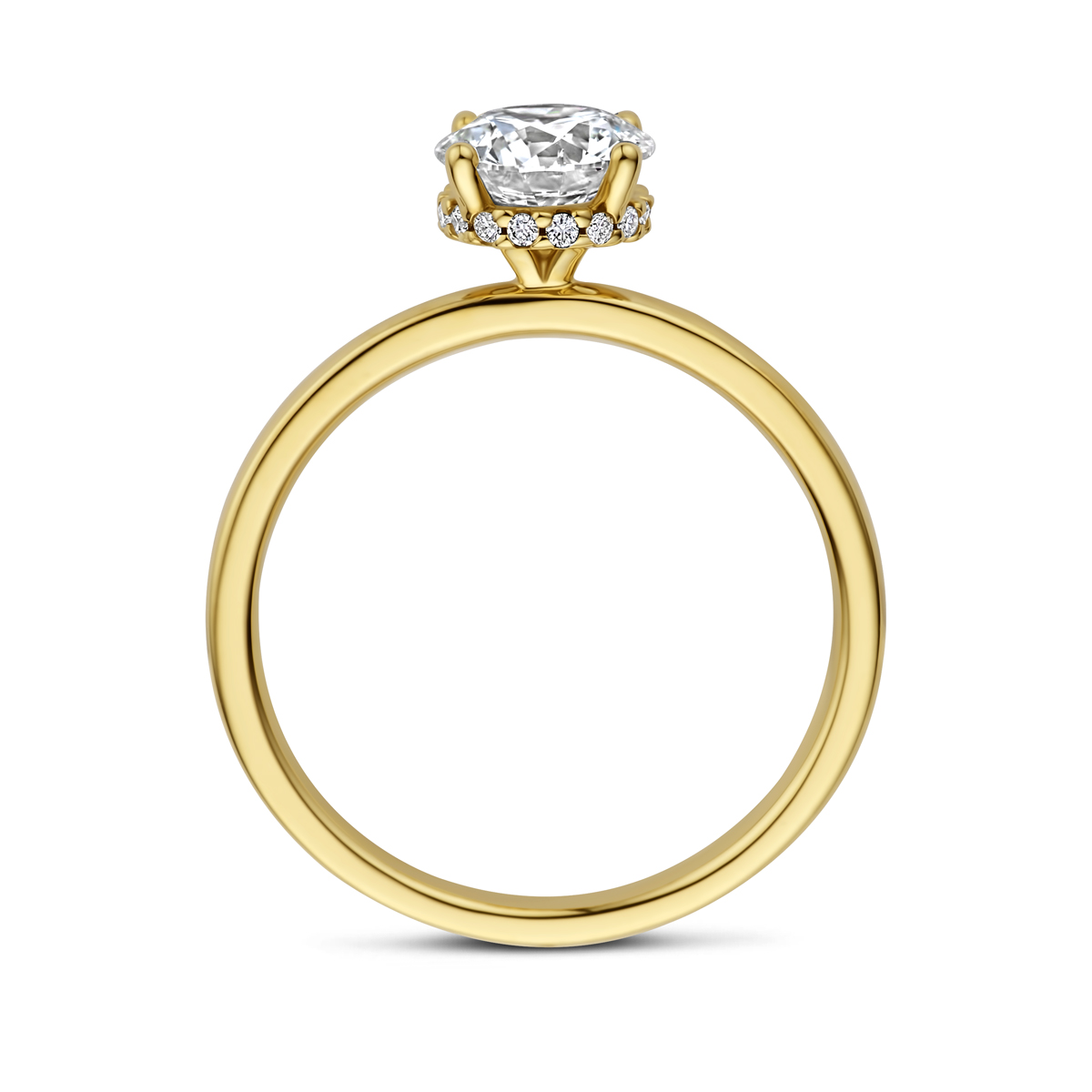 14k Geelgouden ring uitgevoerd met lab grown diamanten. De ringkop heeft een diameter van 6,5 en een hoogte van 5mm. Het totale diamantgewicht is 1.07ct.