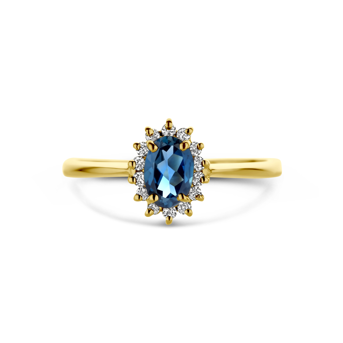 14k Geelgouden ring uitgevoerd met london blue topaas en diamant. De ring heeft een afmeting van 9x7mm. Het diamantgewicht is 0.11ct.