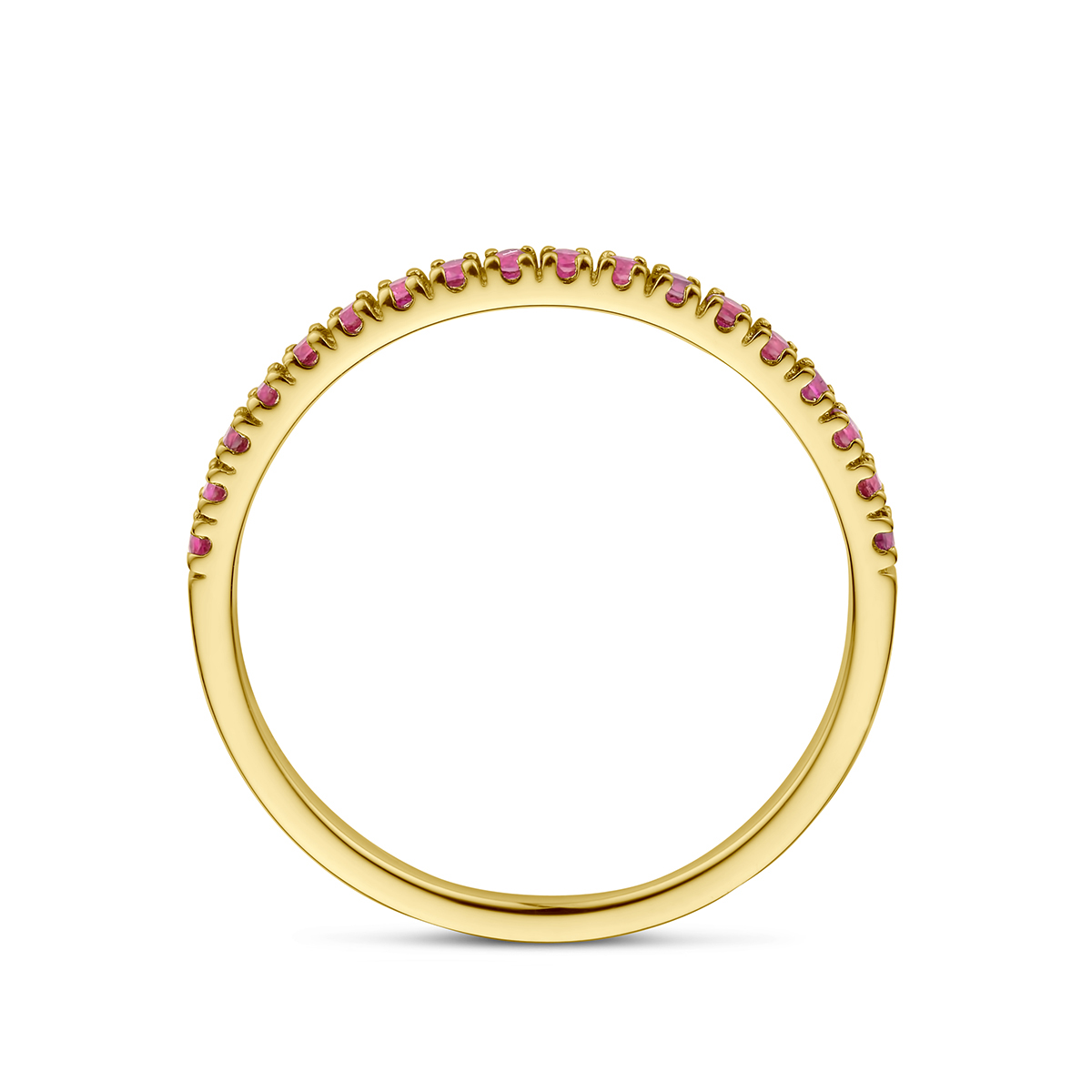 14k Geelgouden ring met geboortesteen uitgevoerd met robijn. De ring heeft een breedte van 1.5mm.
