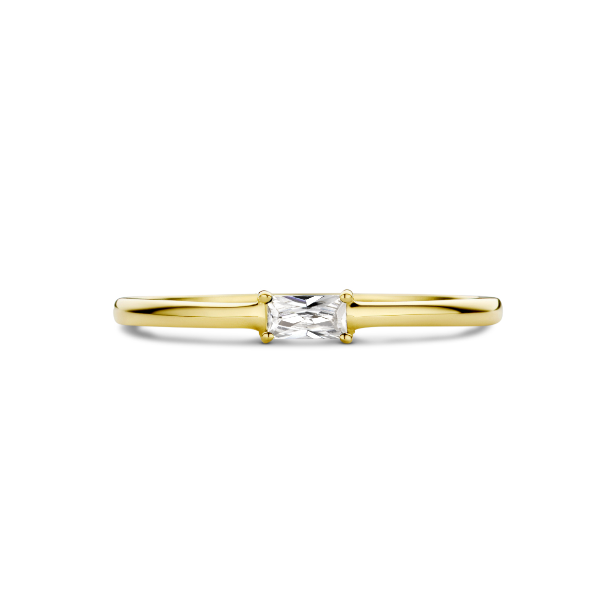 14k Geelgouden ring uitgevoerd met een schitterende zirkonia. De ring heeft een breedte van 2.5mm.