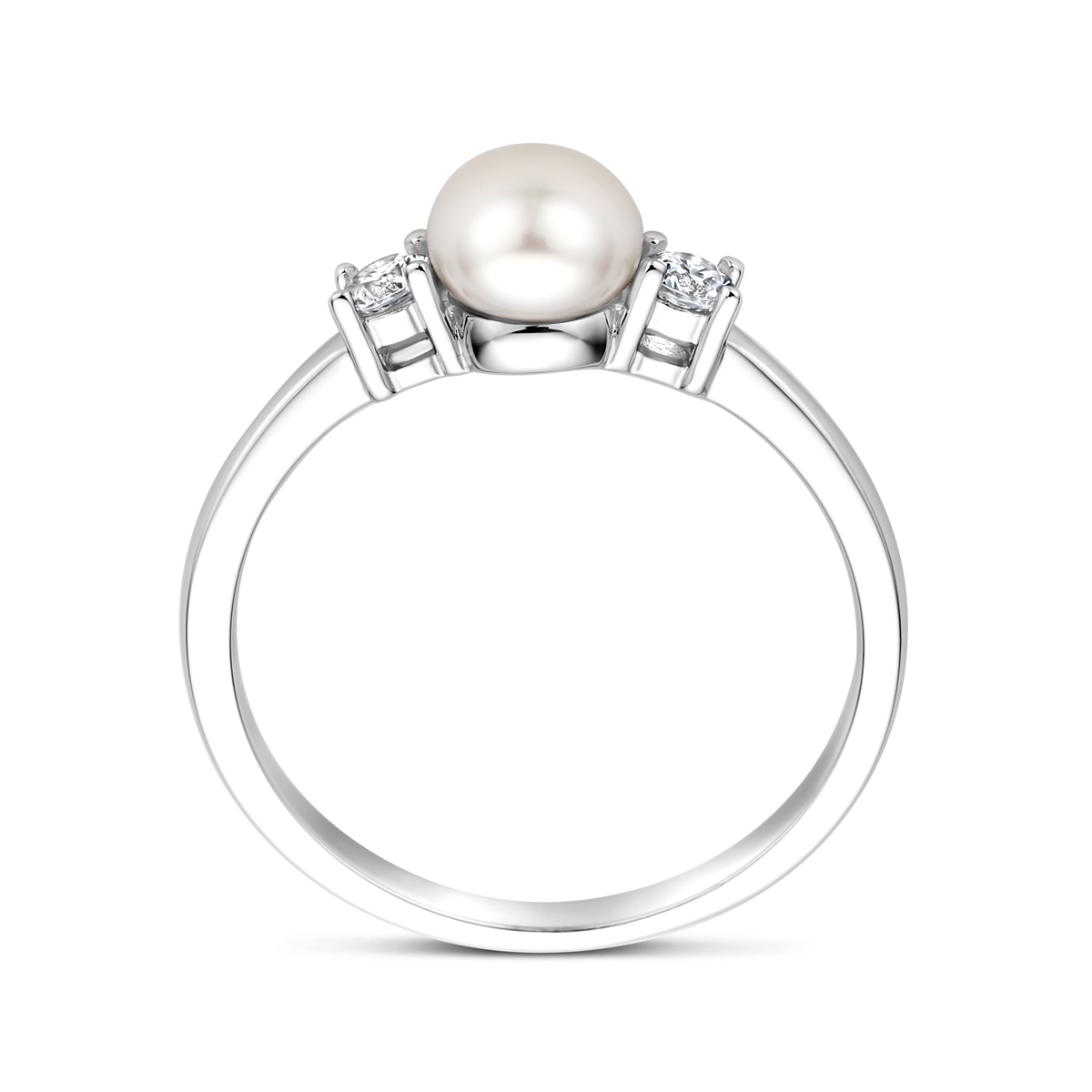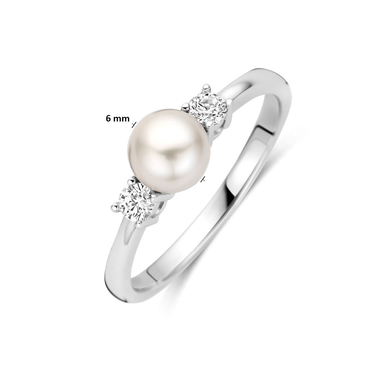 Gerhodineerd 925 zilveren ring uitgevoerd met zirkonia en een parel van 6mm.