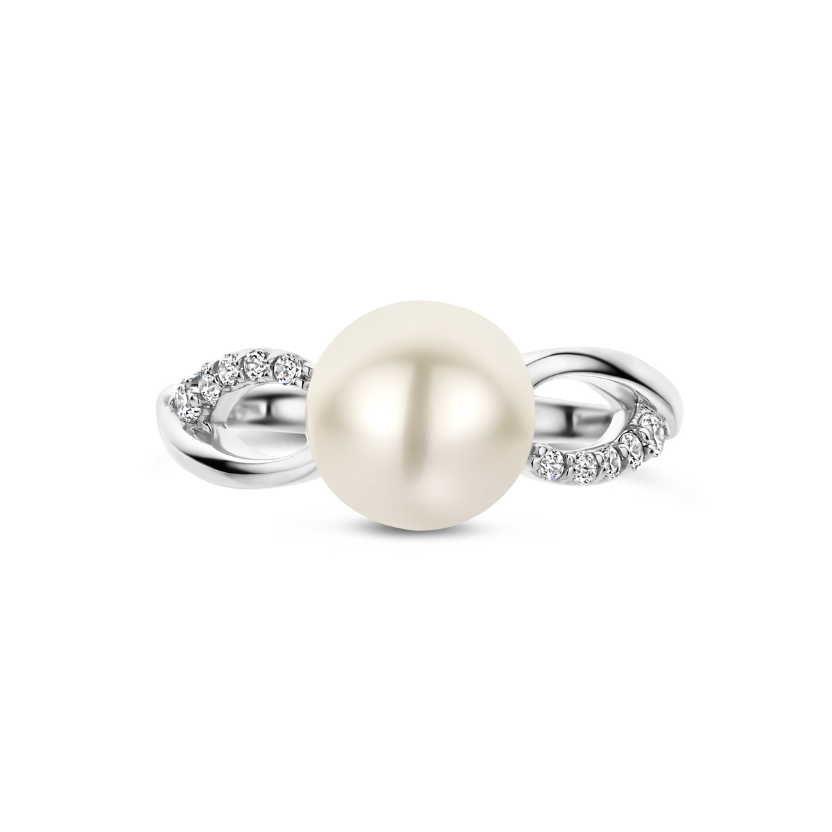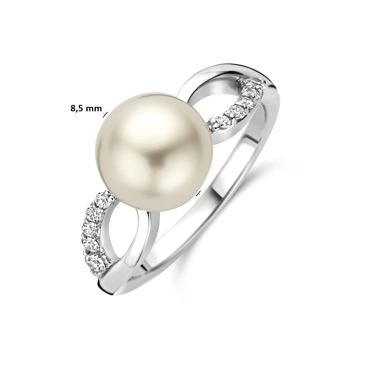 Gerhodineerd 925 zilveren ring uitgevoerd met zirkonia en parel van 8,5mm.