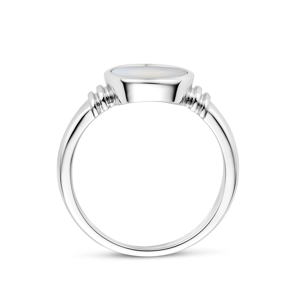 Gerhodineerd zilveren ring met witte parelmoer en een poli afwerking. De ring heeft een afmeting van 12x10mm.