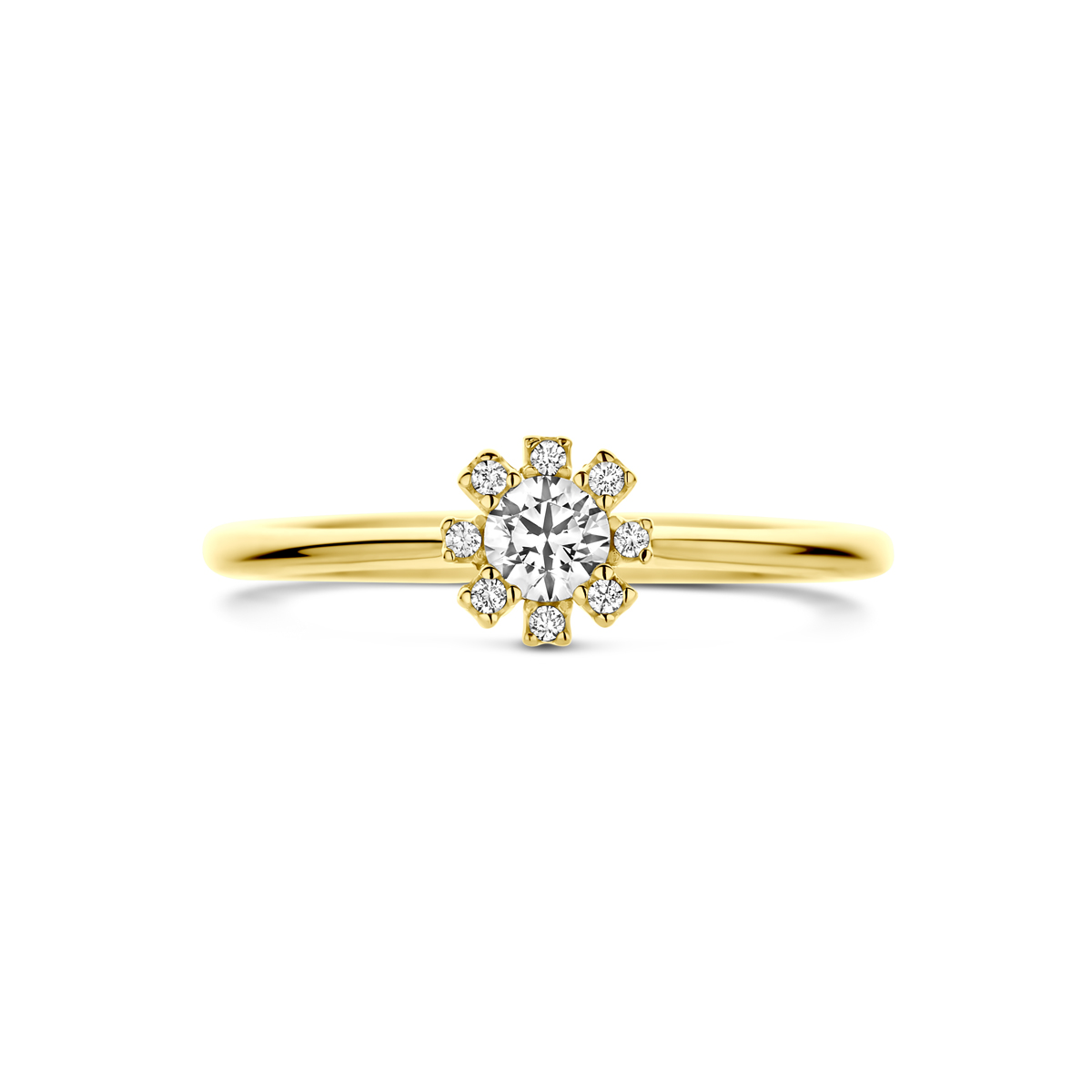 14k Geelgouden ring uitgevoerd met zirkonia. De ring heeft een breedte van 6mm.