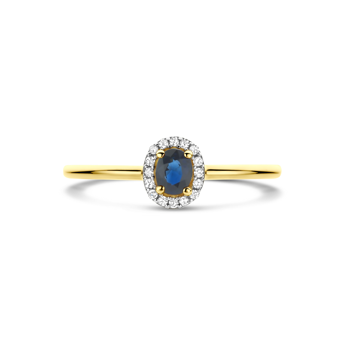 14k Geelgouden ring uitgevoerd met saffier en diamant. De ring heeft een afmeting van 6.5×5.5mm. Het totale diamantgewicht is 0.05ct.