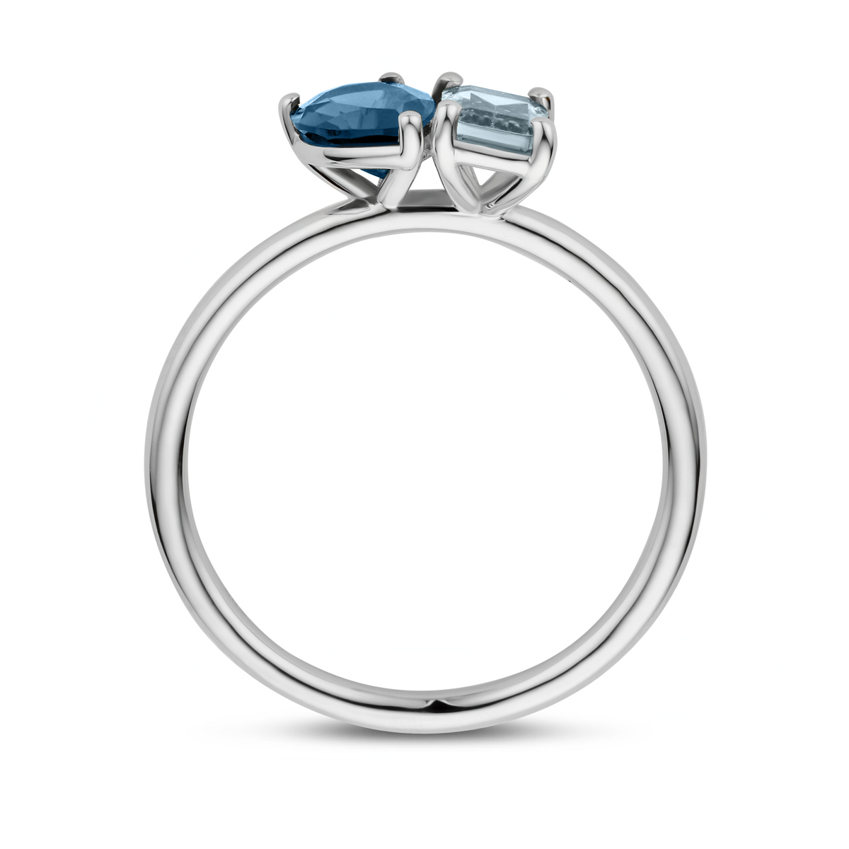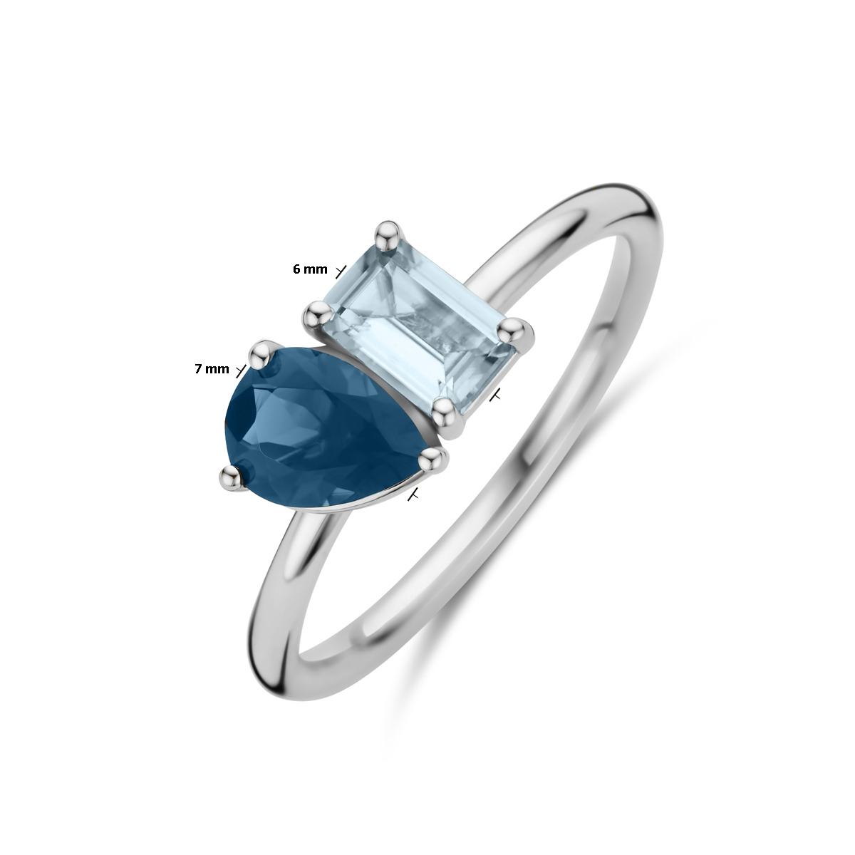 14k Witgouden ring uitgevoerd met sky blue topaas en london blue topaas. De ring heeft een breedte van 7mm. De stenen hebben een afmeting van 7x5mm en 6x4mm.