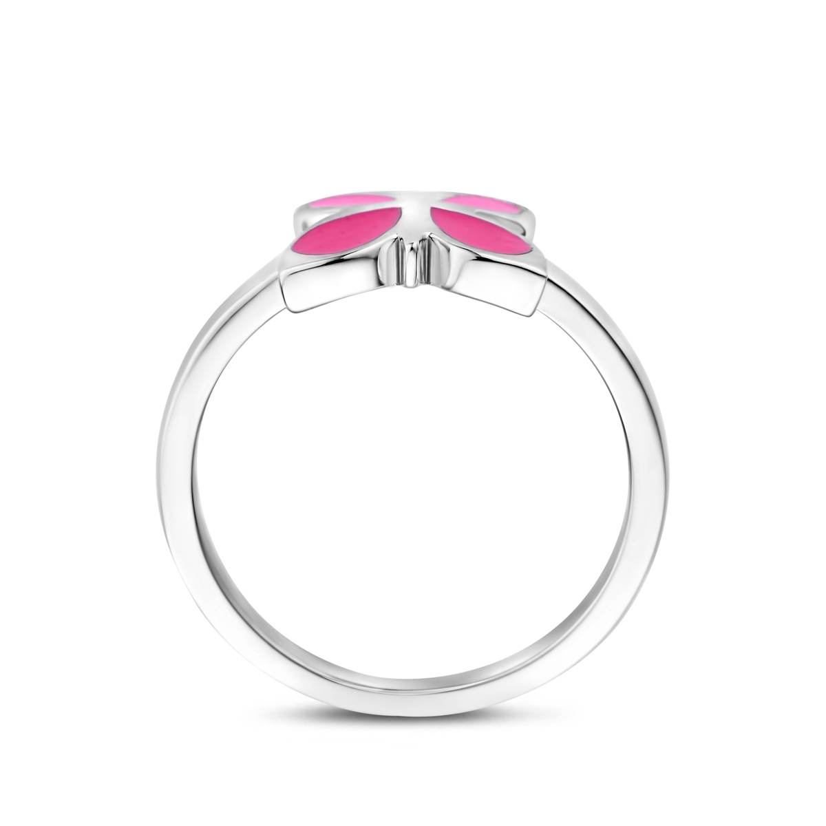 Gerhodineerd zilveren vlinder ring uitgevoerd met rood en roze emaille. De ring is er in verschillende maten en heeft een breedte van 9mm. U kunt deze ring combineren met bijpassende sieraden uit onze collectie.