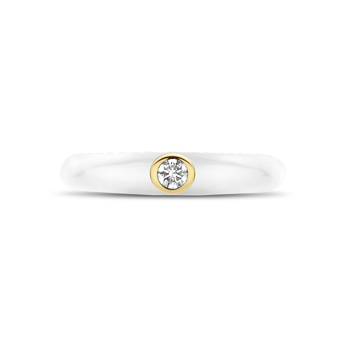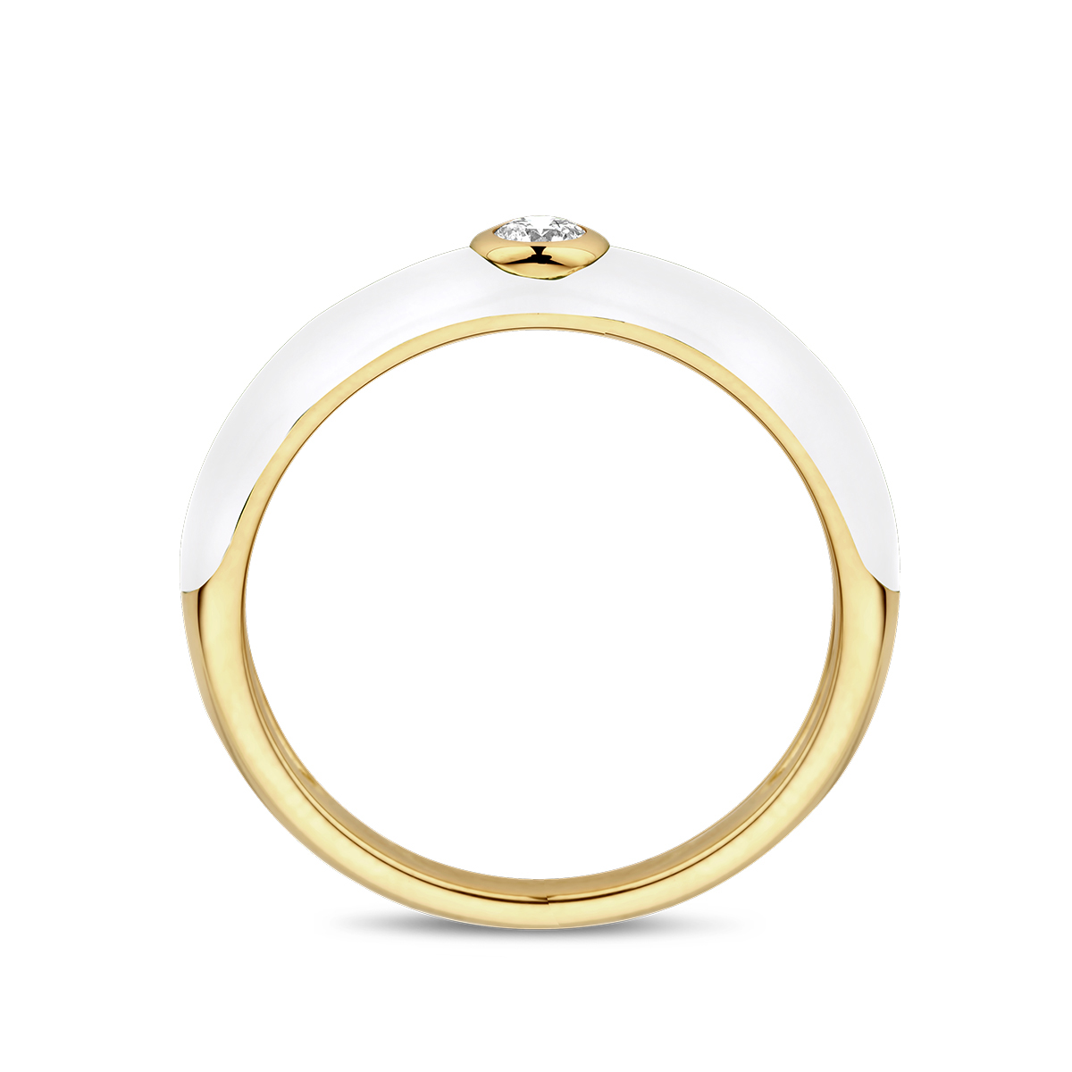 14k Geelgouden ring uitgevoerd met wit emaille en diamant. De ring heeft een breedte van 4mm.