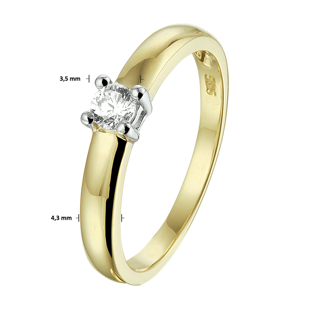 Bicolor wit- en geelgouden ring uitgevoerd met een schitterende zirkonia van 3.5mm in een chaton zetting. Tijdloos design voor een chique uitstraling! Draag deze ring apart of naast uw andere ringen om steeds weer een andere look te creeren.