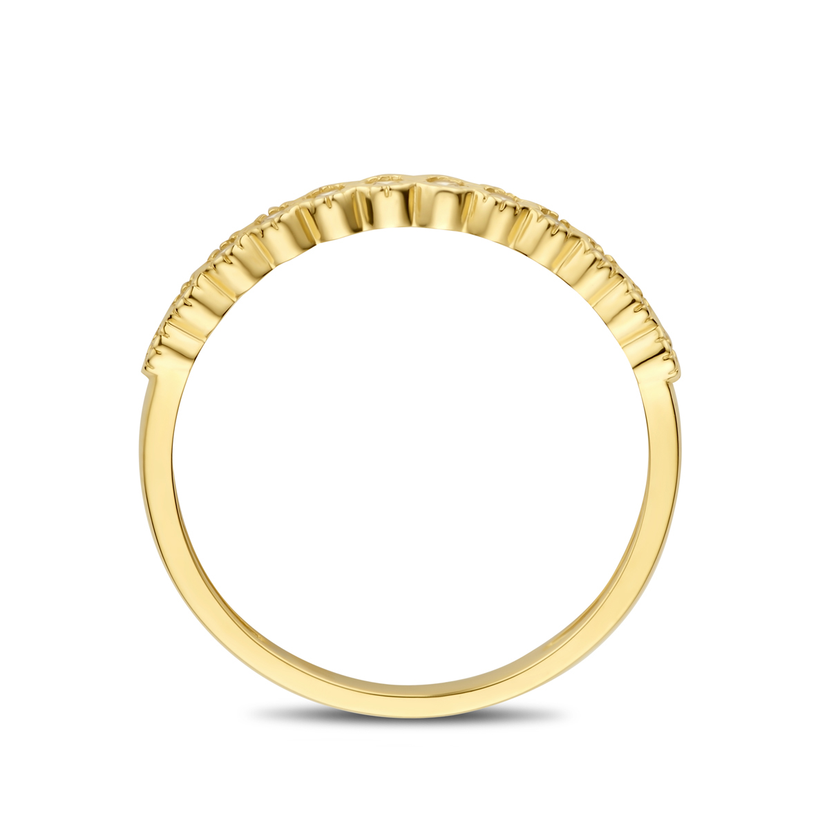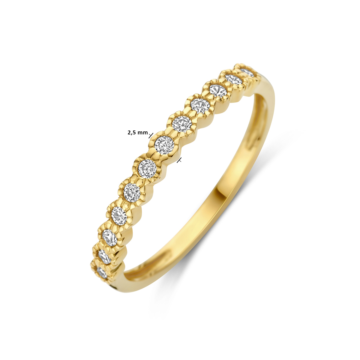 14k Geelgouden ring uitgevoerd met zirkonia. De ring heeft een breedte van 2.5mm.