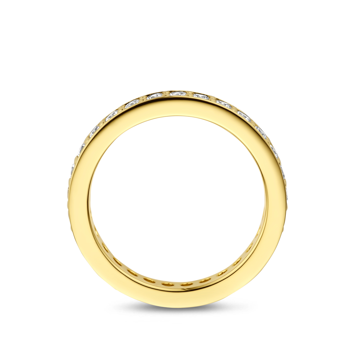 Verguld geel 925 zilveren ring uitgevoerd met zirkonia. De ring heeft een breedte van 2.9mm. Geen garantie op plating.