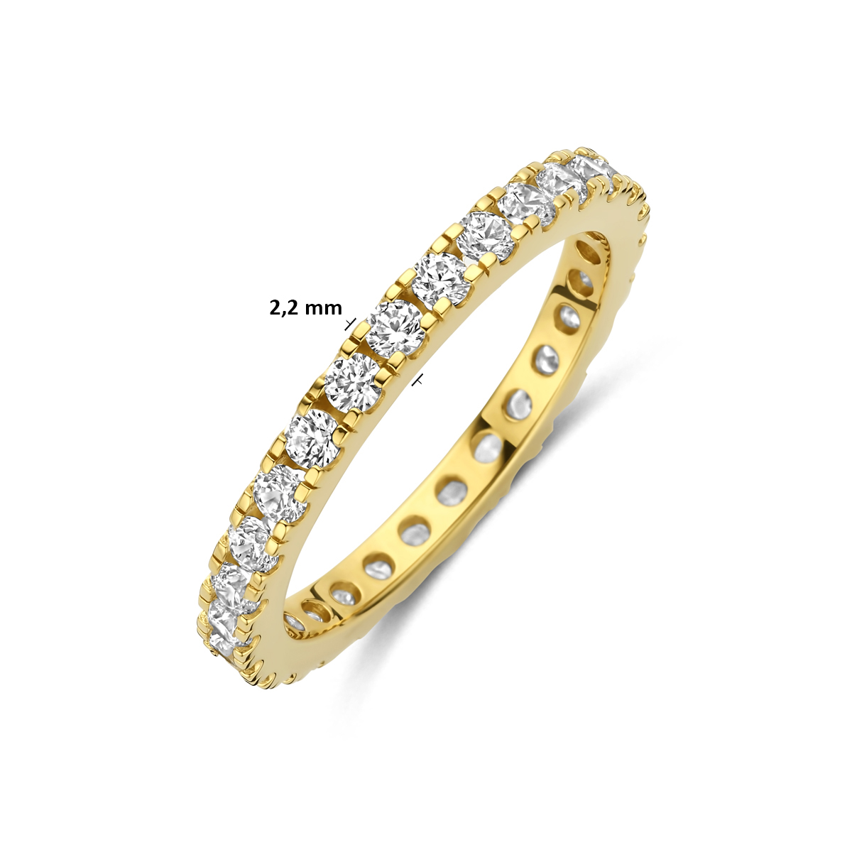 Verguld geel 925 zilveren ring uitgevoerd met zirkonia. De ring heeft een breedte van 2.2mm. Geen garantie op plating.