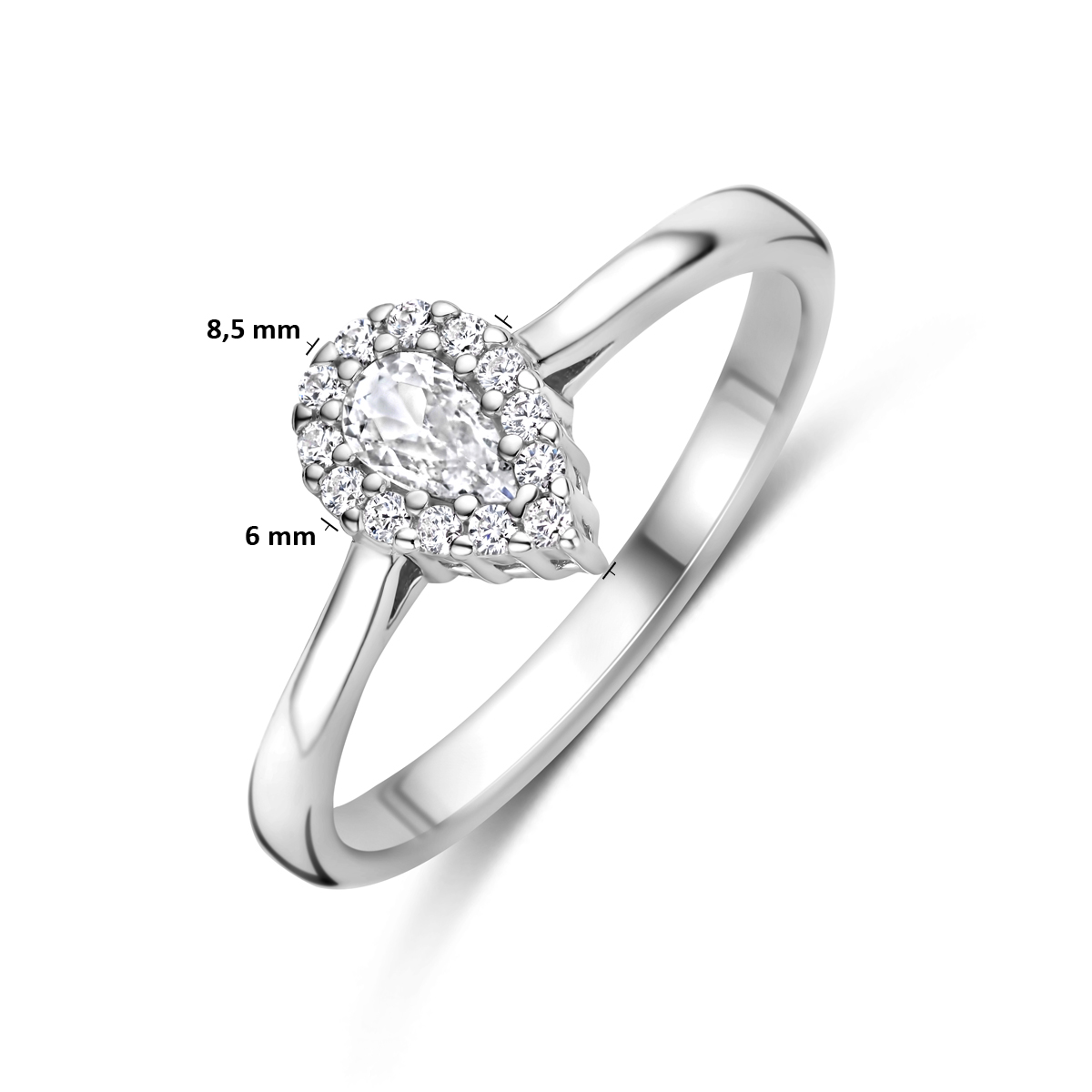 Gerhodineerd 925 zilveren uitgevoerd met zirkonia. De ring heeft een afmeting van 8.5x6mm.