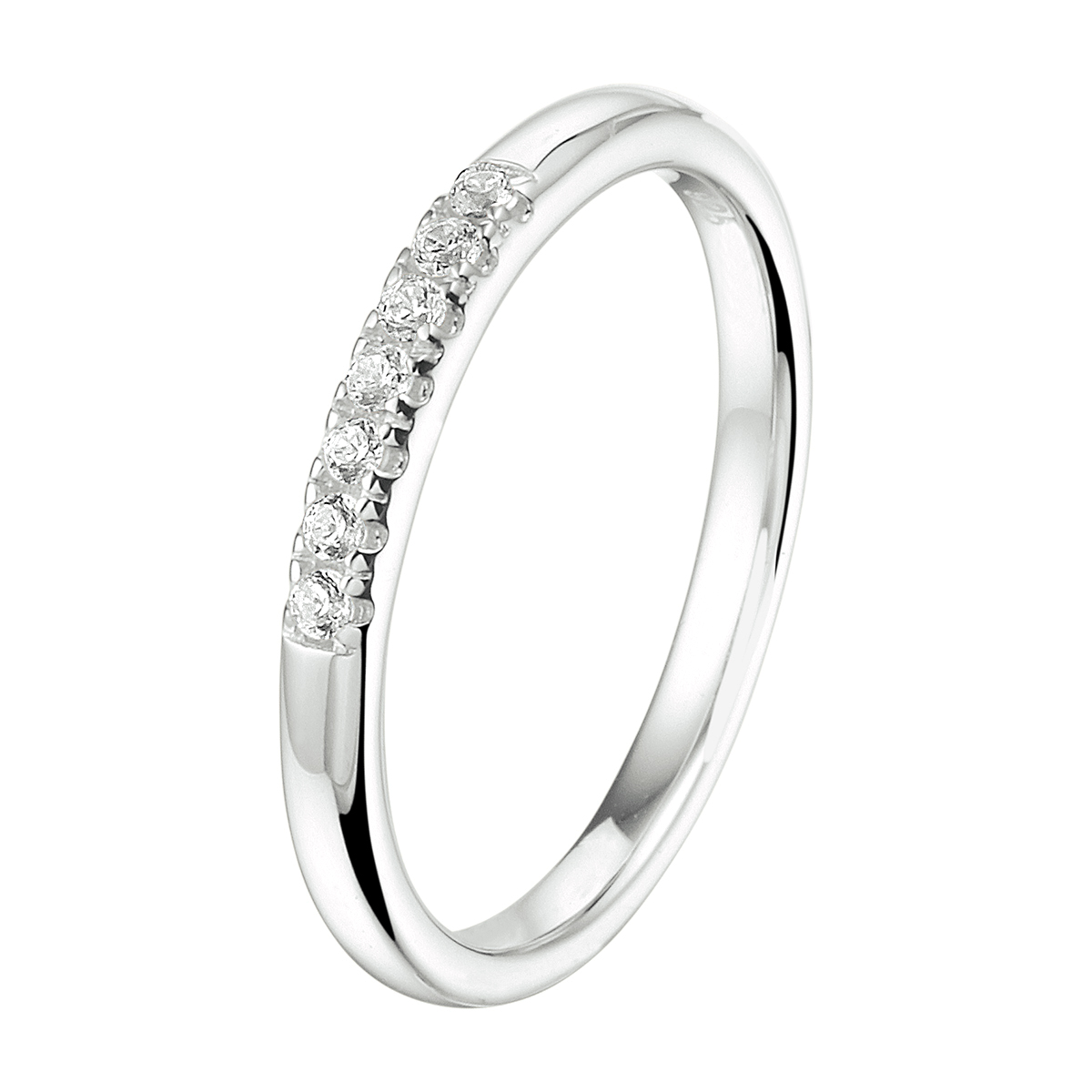 Gerhodineerd 925 zilveren ring uitgevoerd met een schitterende zirkonia rij. De ring heeft een breedte van 2mm.