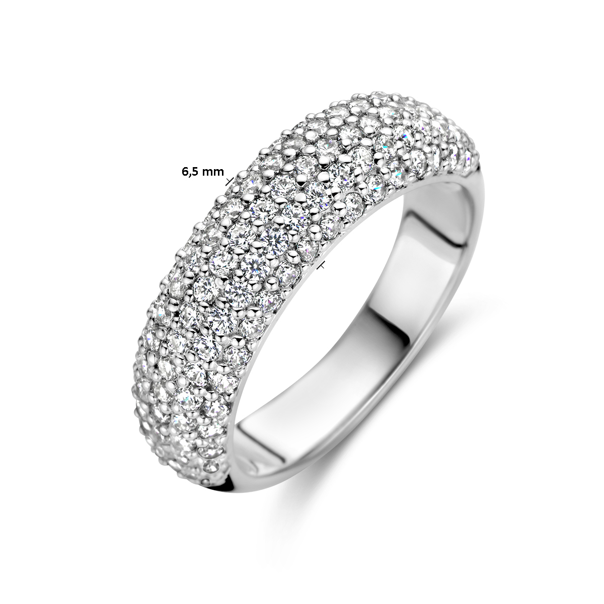 Gerhodineerd 925 zilveren ring uitgevoerd met zirkonia. De ring heeft een breedte van 6.5mm.