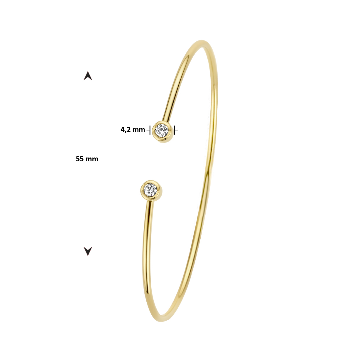 14k Geelgouden armband spang uitgevoerd met schitterende diamanten. De spang heeft een binnendiameter van 55mm.