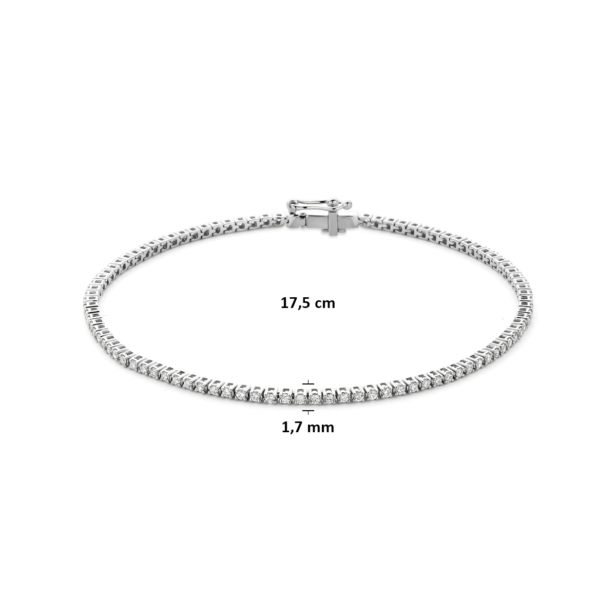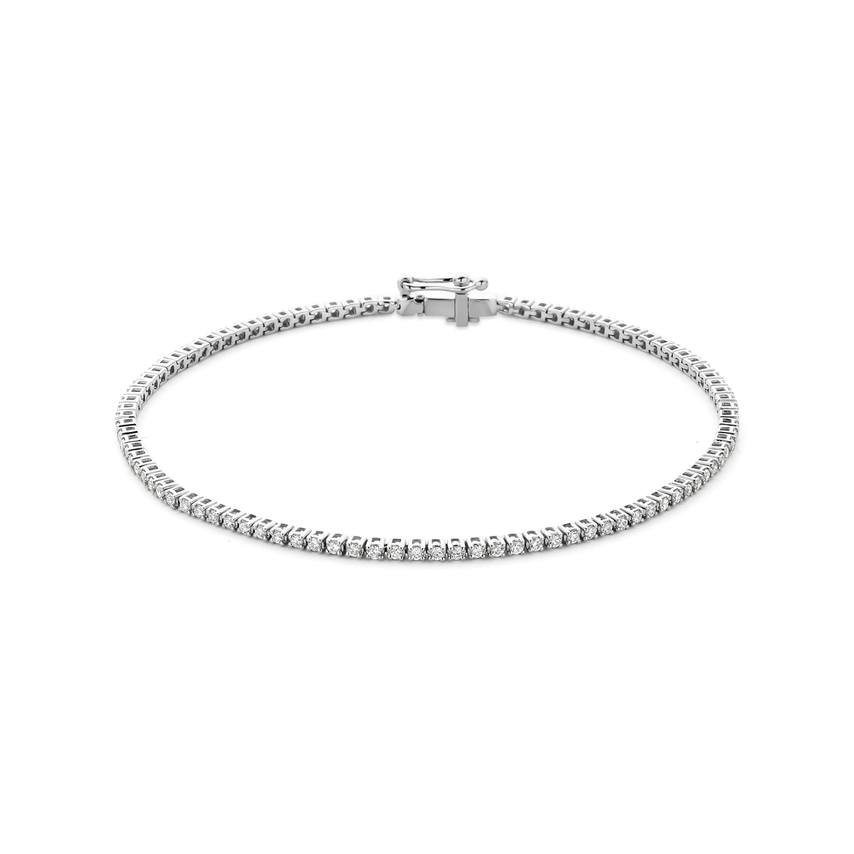 14k Witgouden tennisarmband uitgevoerd met lab grown diamant. De armband heeft een breedte van 1.7mm en een draaglengte van 17.5cm. Het totale diamantgewicht is 1.00ct. Lab grown diamanten zijn diamanten die ontstaan in een laboratorium. Onder extreem hoge druk en temperatuur wordt het natuurlijk ontstaansproces nagebootst met als eindresultaat een diamant met dezelfde chemische eigenschappen maar met een andere oorsprong.