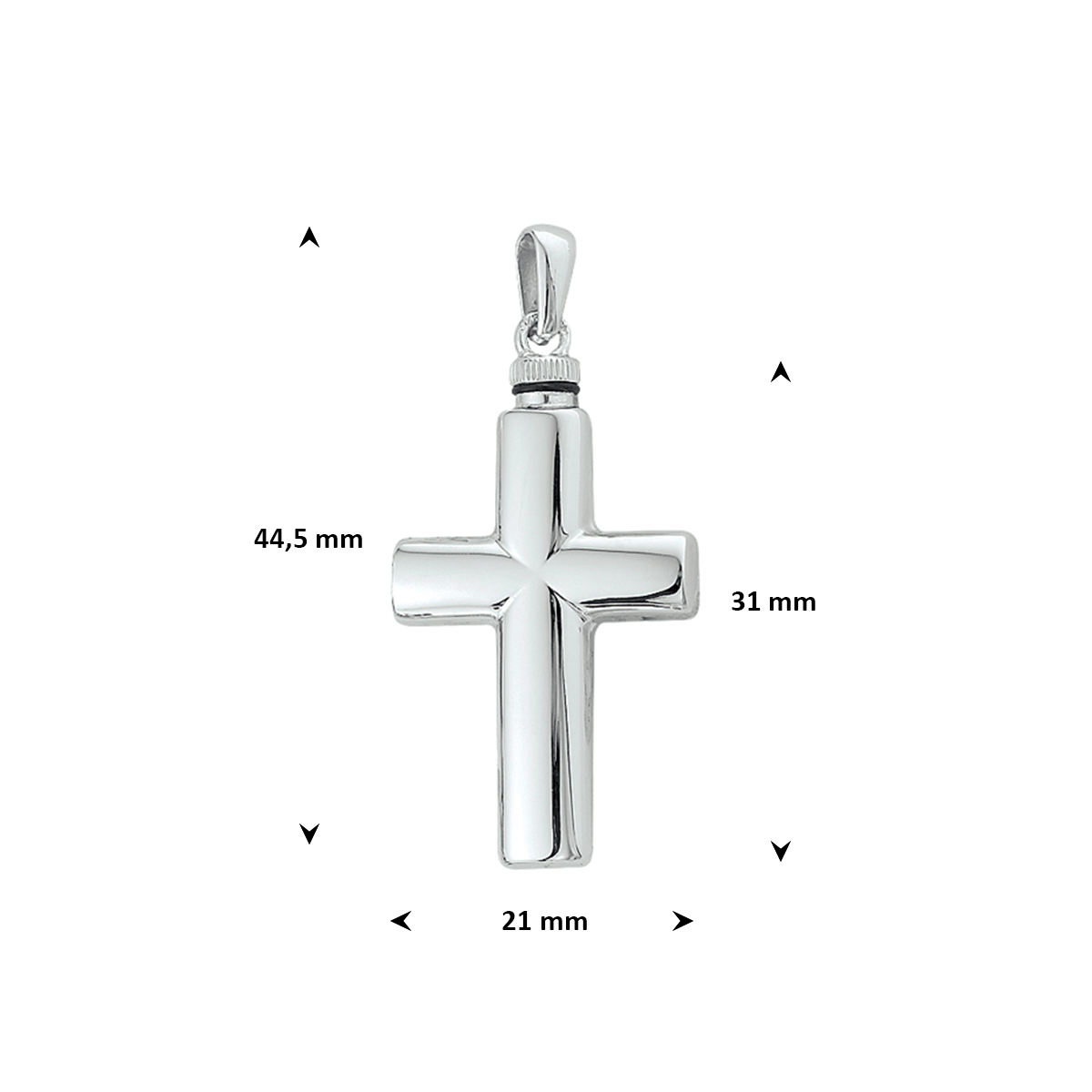Gerhodineerd 925 zilveren urnhanger in de vorm van een kruis. De hanger heeft een hoogte van 31mm excl. oogje en een breedte van 21mm.