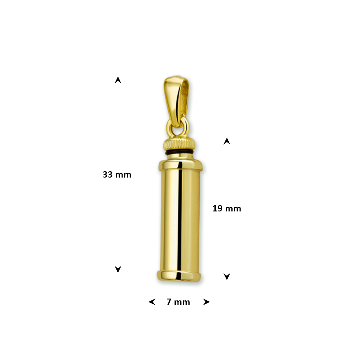 Geelgouden urnhanger met een poli afwerking. De hanger heeft een hoogte van 19mm excl. oogje en een breedte van 7mm.