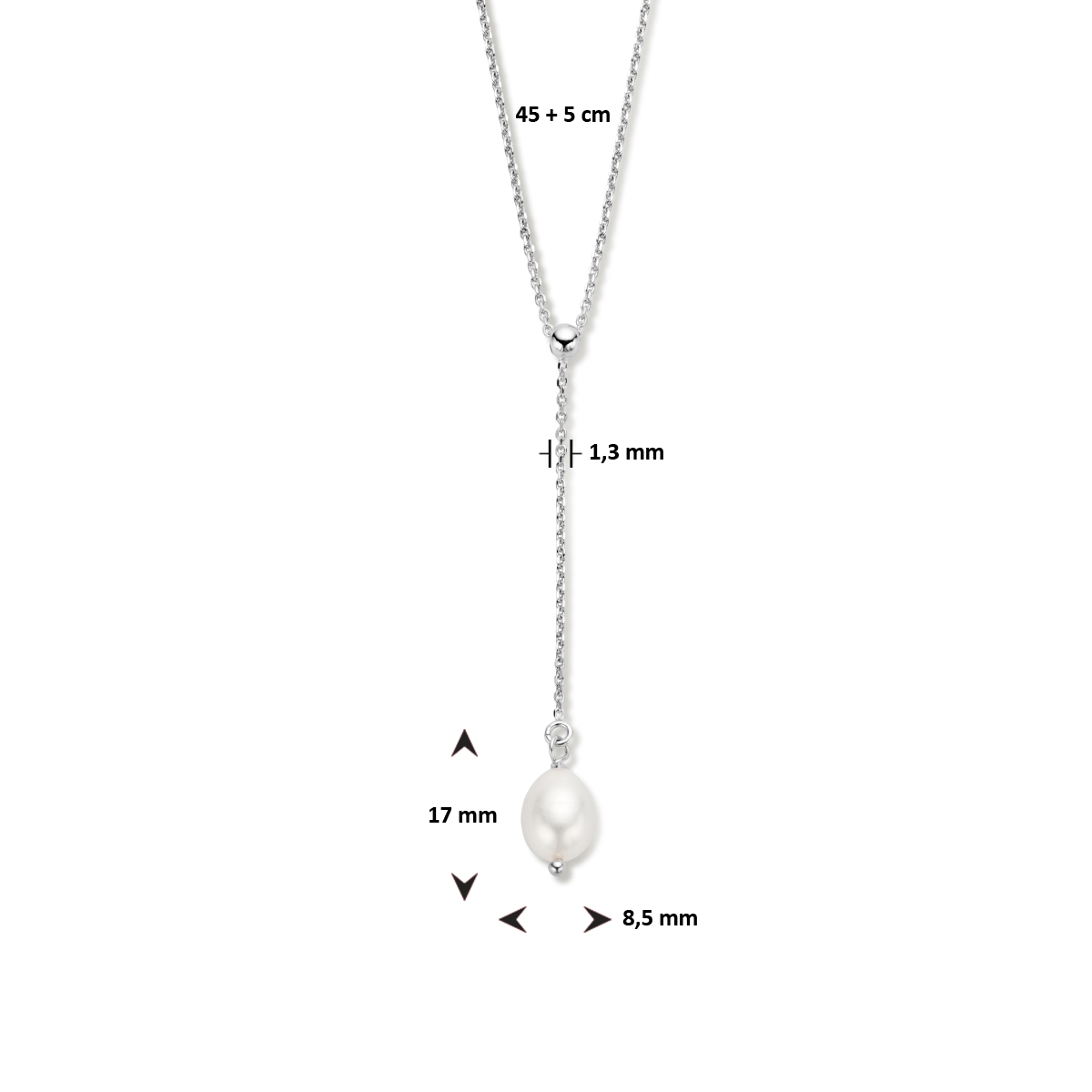 Gerhodineerd 925 zilveren collier met een zoetwaterparel. Het collier heeft een draaglengte van 45cm en een extensie van 5cm. De schakelbreedte is 1.3mm. Uitgevoerd met een karabijn sluiting.
